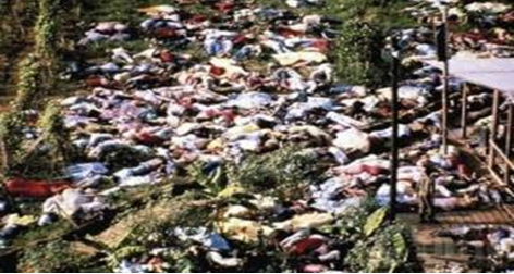——人民圣殿教。人民圣殿教主琼斯自称是神的化身,几千年前化身为释迦牟尼,创建了佛教,后来又化身耶稣基督,创建了基督教,后来又化身列宁,将社会主义发扬光大。1978年11月,美国众议员利奥?瑞安(Leo Ryan)为调查对该教派的指控,来到圭亚那的琼斯镇。一些信众向瑞安表示想跟他离开,11月18日众人到达当地的一个小型机场,但在那里遭受教派守卫开火袭击,瑞安、三位记者及一位打算离开的信众被杀,多人受伤。琼斯自知罪责难逃,于是在1978年11月18日当晚胁迫追随者与他一起自杀。琼斯命令他的信众饮下掺有氰化物的果汁,那些抗拒这命令的人被射杀、勒死或被注射氰化物。琼斯的尸体被发现在头上有一处枪伤,体内亦有高剂量的药物。这次集体自杀事件共有909人死亡,其中包括276个儿童。