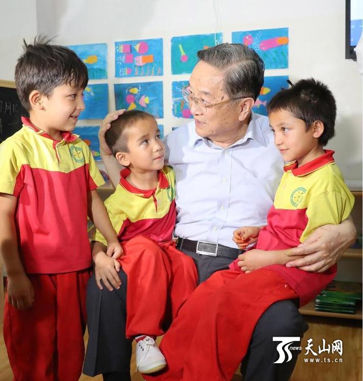 7月10日,中共中央政治局常委、全国政协主席俞正声来到喀什市乃则尔巴格镇尤喀克喀孜热克村双语幼儿园,走到孩子们中间详细了解幼儿的生活学习情况,勉励他们好好学习,快乐成长。 □新疆日报记者崔志坚摄