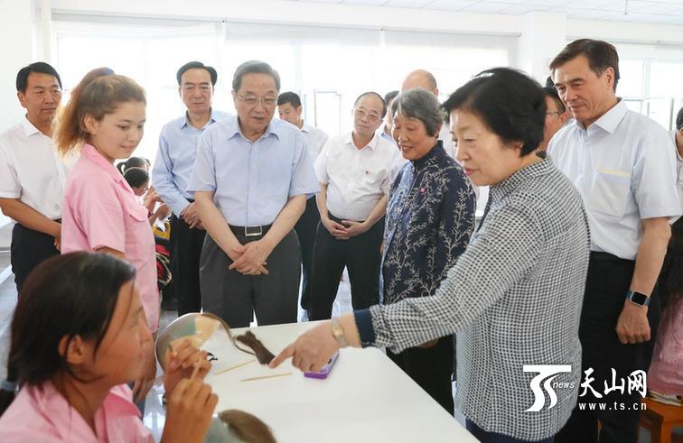 7月9日,中共中央政治局常委、全国政协主席俞正声来到新疆即发华和服装有限公司,详细了解企业生产经营及吸纳当地群众就业等情况。□新疆日报记者崔志坚摄